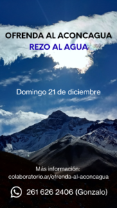 Sintiendo el llamado de hacer un Rezo al Agua con toda la comunidad del territorio de Mendoza y quienes sientan llegar de otros lugares, el día domingo 21 de diciembre subiremos hasta Confluencia para hacer una Ofrenda al Aconcagua.